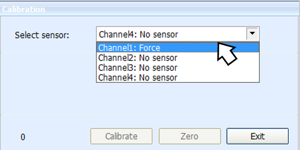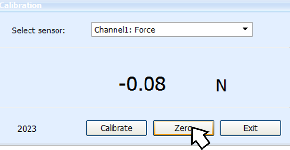 1. The calibration will appear, select the “force sensor” at Channel 1 and click the “zero” button.
