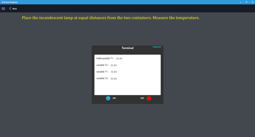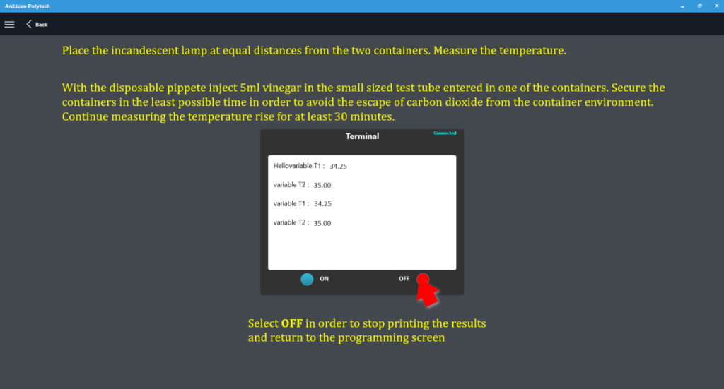 - On the Terminal window click OFF to stop printing the values to the terminal