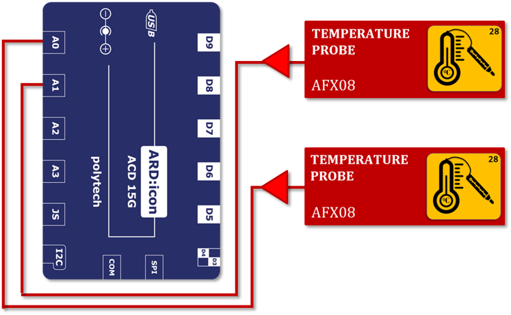 - Connect the second Temperature sensor with probe AFX04 to ARD:icon analog port 1 (A1).