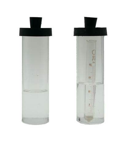 - With a metal spatula add 2-3 parts of baking soda into the test tube and place the tube into one of the two acrylic containers. Seal the containers with the rubber cap.