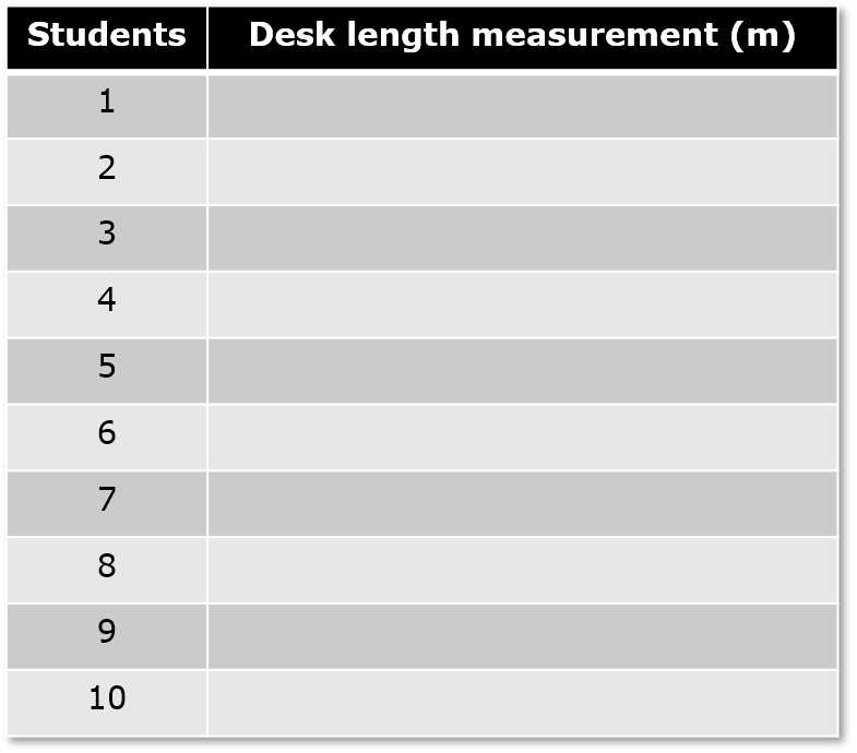- Students will measure the length of the desk using the retractable ruler and will record their results in the table below in meters. Then, they will calculate the average (mean) of all measurements.