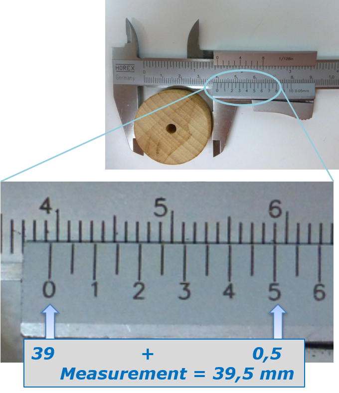 For example if we want to measure the diameter of a wooden pulley, we open the caliper just over the length to be measured and place the piece in the fixed caliper jaw. Then, we approach the movable jaw and read the value.