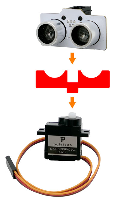 - Attach the Ultrasonic Range Detector to the Micro Servo DJX11 via the red adaptor.