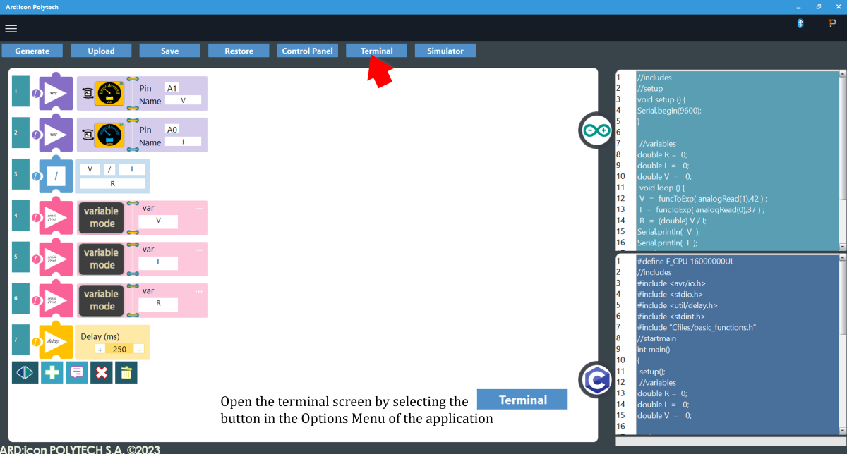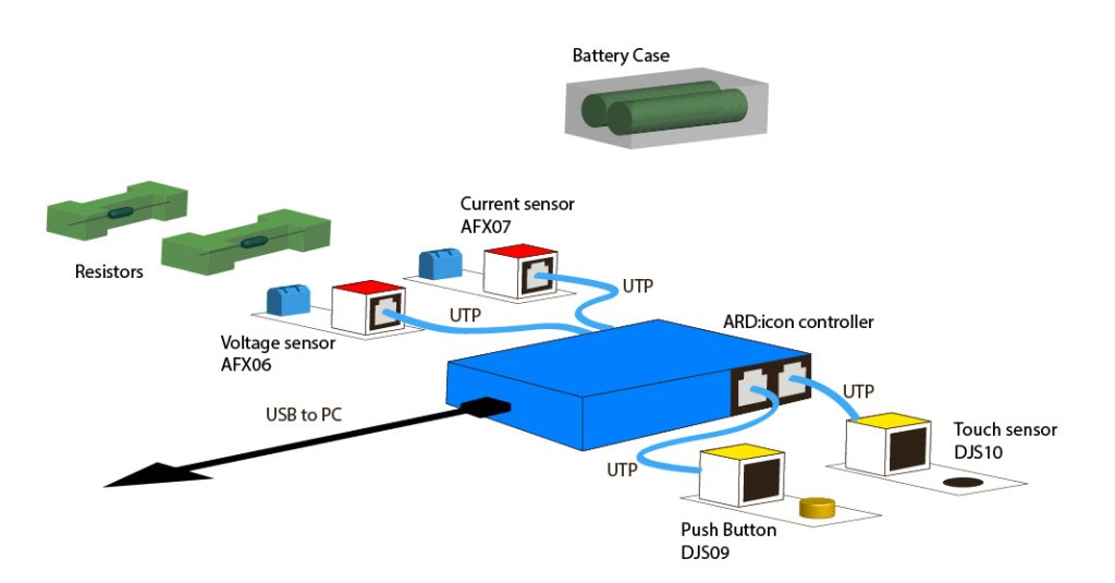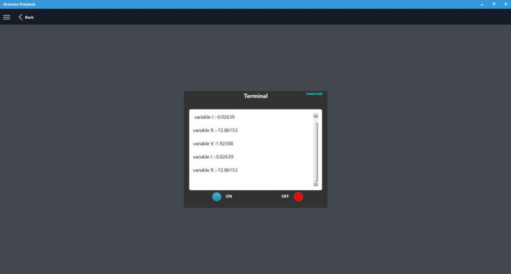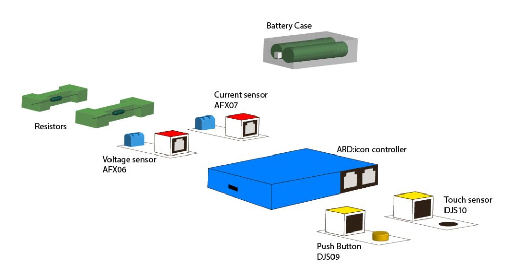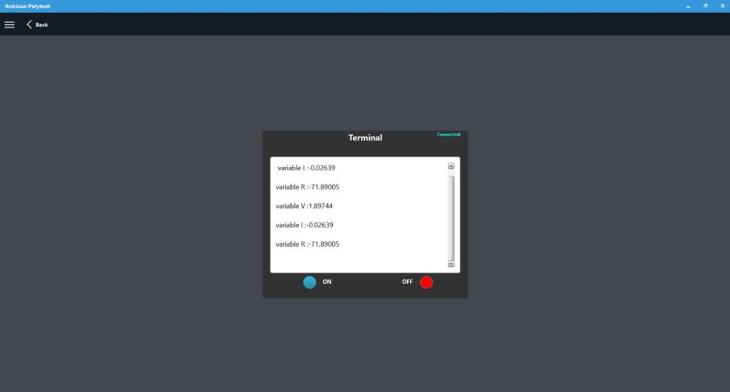 - Part 2: At part 2 by using the ARD:icon software you will measure the total current, resistance and power of the circuit. Once you have uploaded the code to the ARD:icon controller and open the terminal, you have to connect the Circuit 1. Touch the touch sensor one time to take the measurement for knob 1. Then connect the circuit 2 and push continuously the push button and see the results that are printed to the terminal screen.