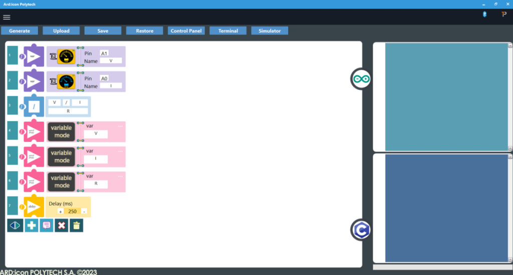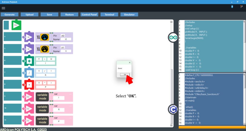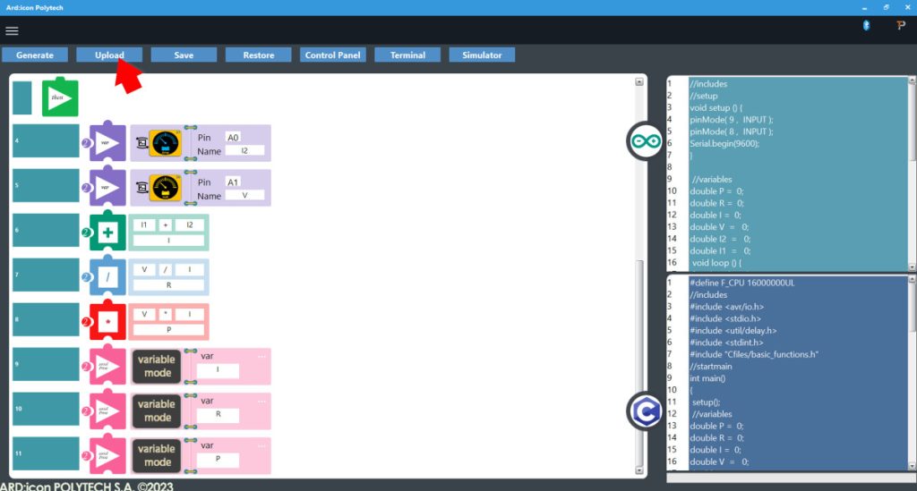 - Press Upload to upload the generated code to the ARD:icon controller