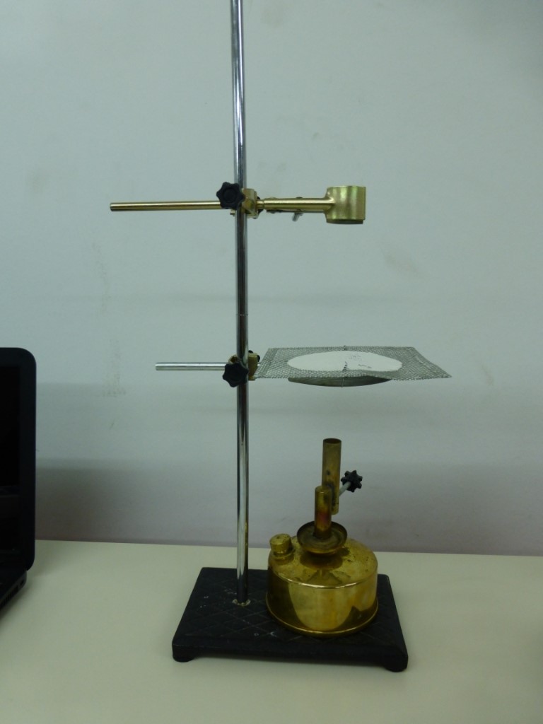 - Set up the metal base, the retort ring with gauze and the metal clamp according to the picture.