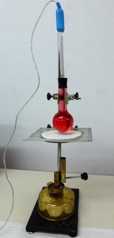 - Add (heated) water into the round bottomed flask and adjust the flask to the metal clamp. Seal the flask with the rubber cap.